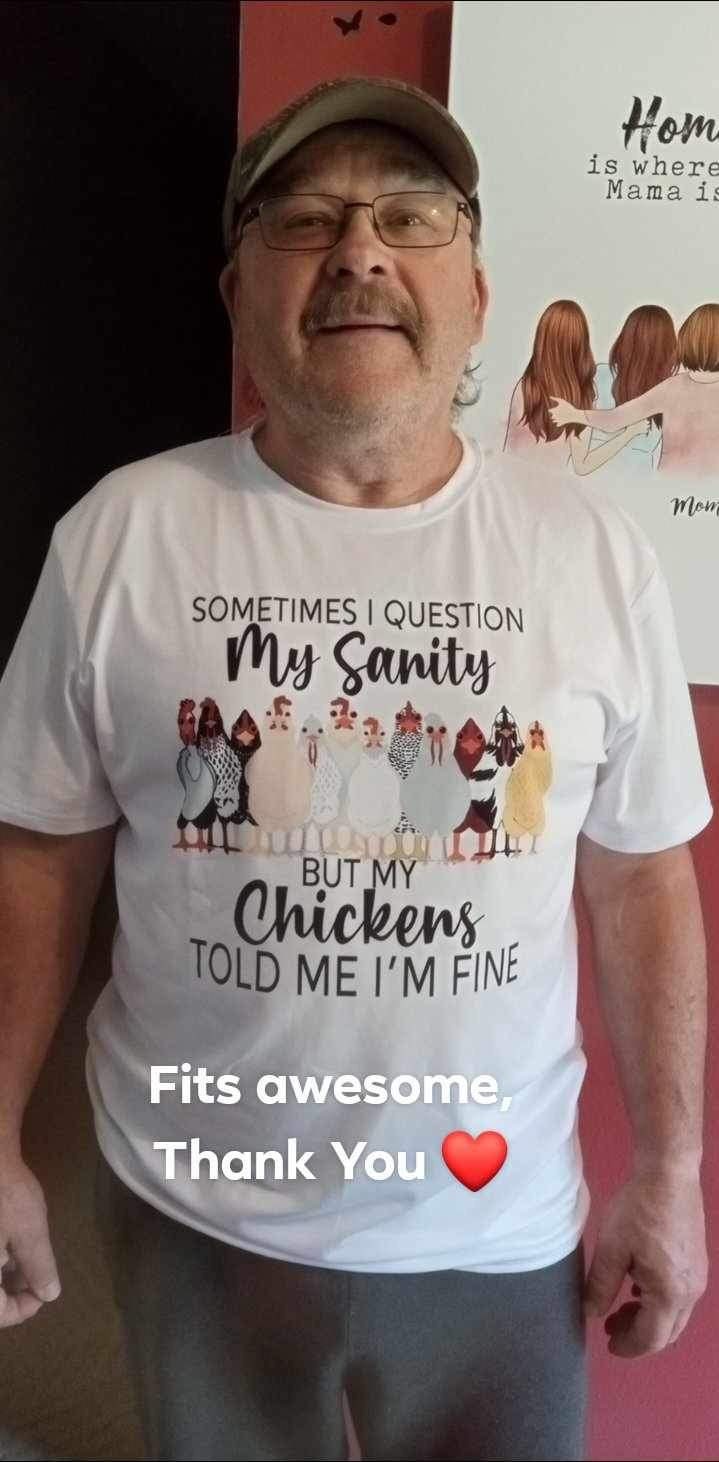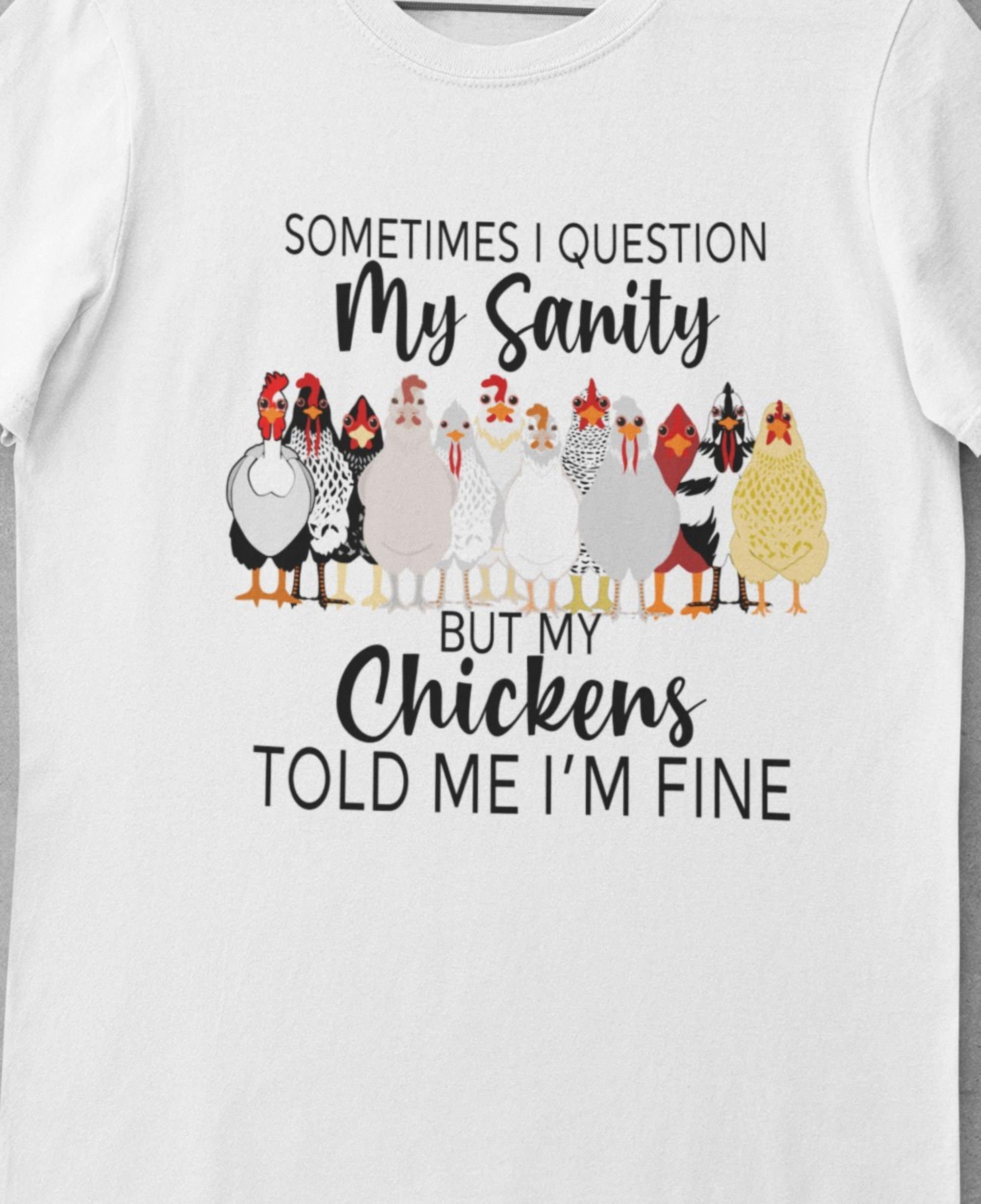 Fun Shirt, Great Gift for Chicken Fanatics! "SOMETIMES I QUESTION MY SANITY, BUT MY CHICKENS TOLD ME I'M FINE"