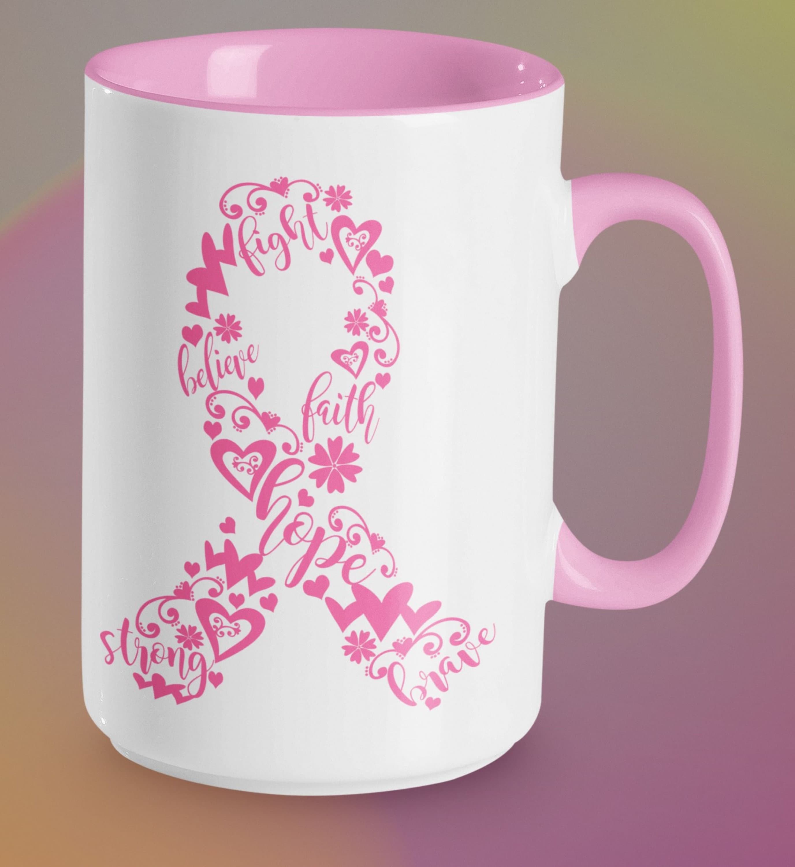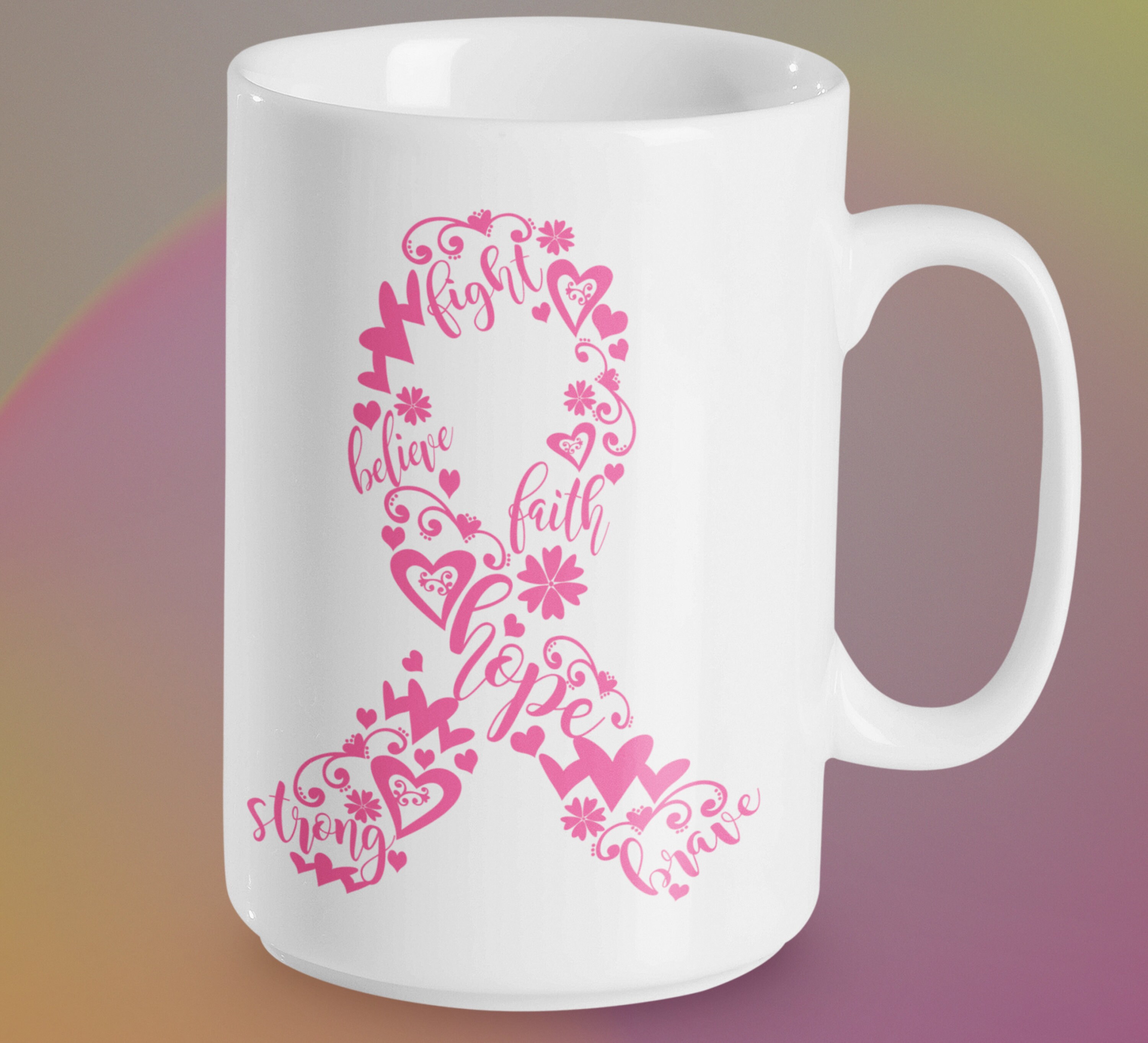 Beautiful ribbon with hearts, words, breast cancer awareness on a heavy-weight large 15 oz coffee mug.