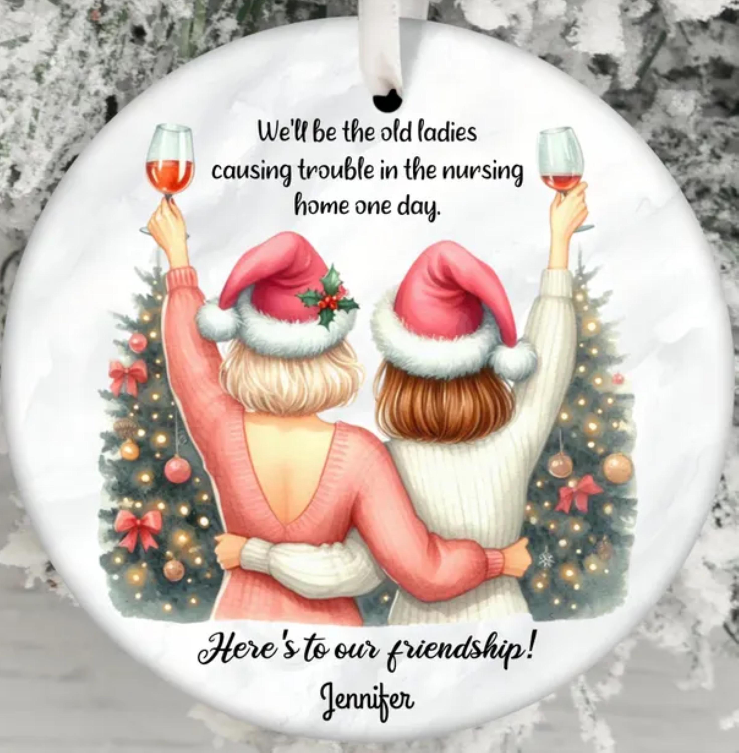 Personalized Funny "We'll be Old Ladies Causing Trouble in the Nursing Home" Christmas Ornament. Includes gift box.