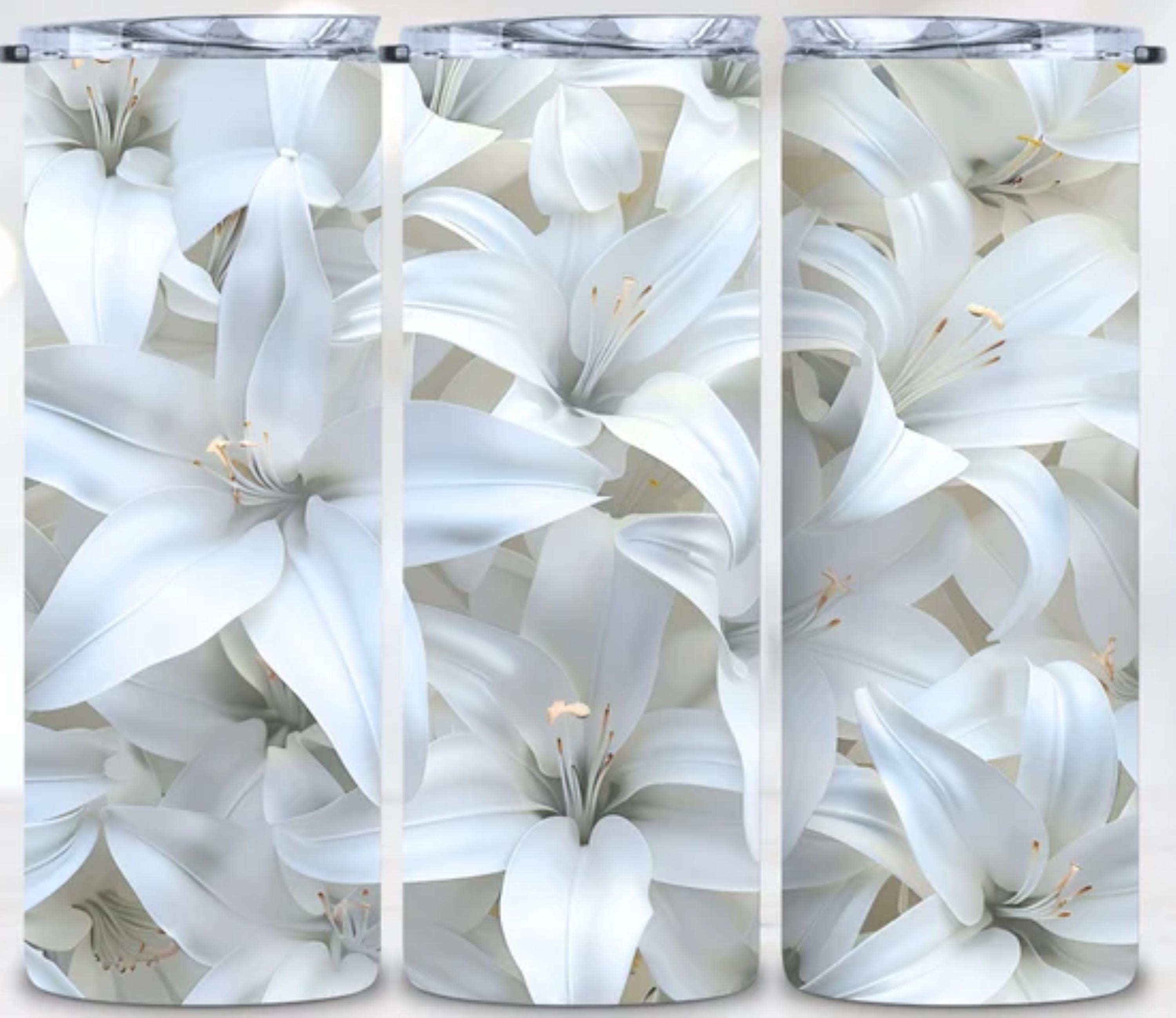 3D-Look White Lillies Tumbler, 20 oz Double-Wall Stainless Steel Tumbler, Keeps hot drinks hot and cold drinks cold for hours!