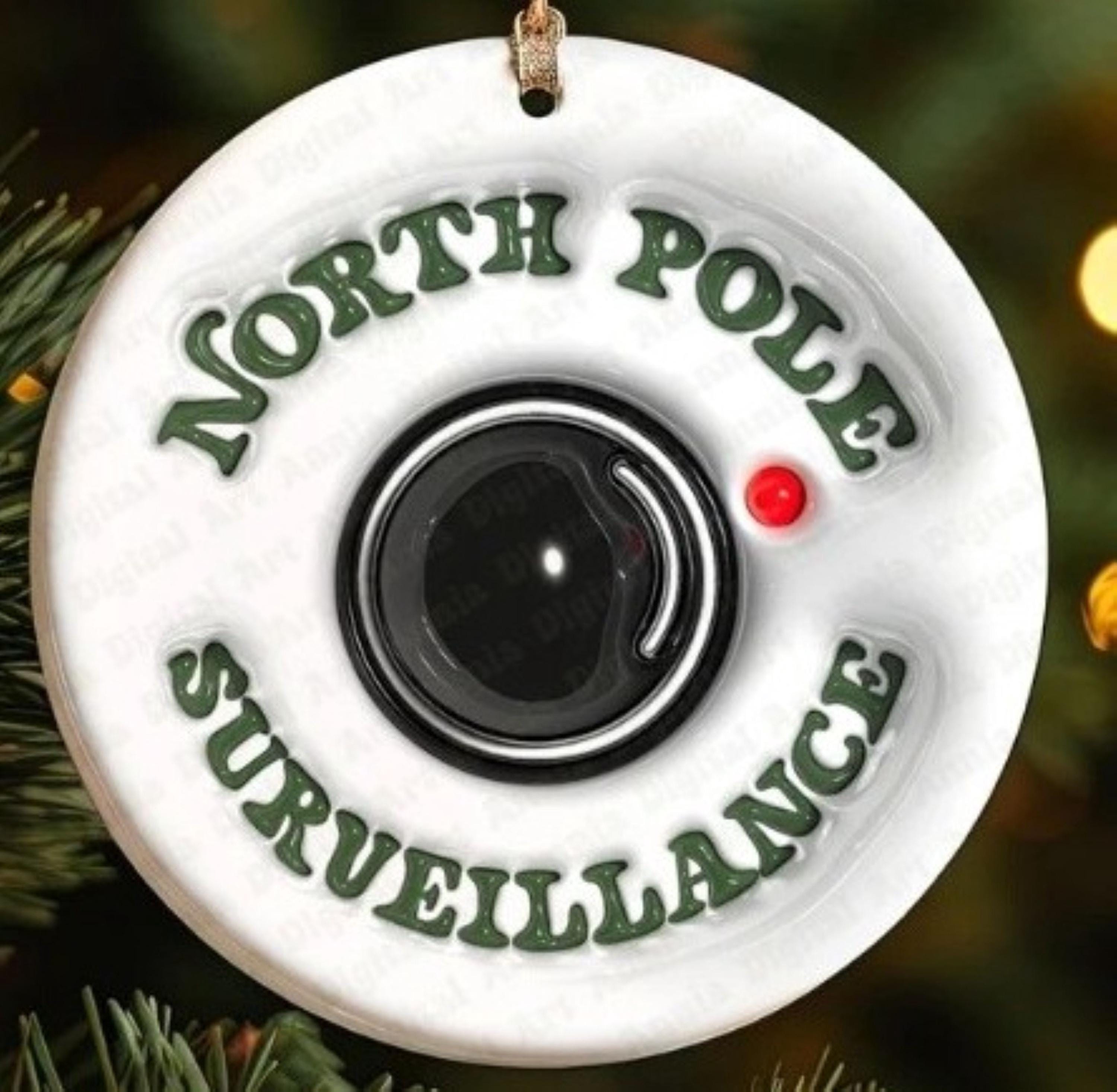North Pole Surveillance Ornament. Includes Gift Box. Can be printed on both sides or personalized message can be added to back.