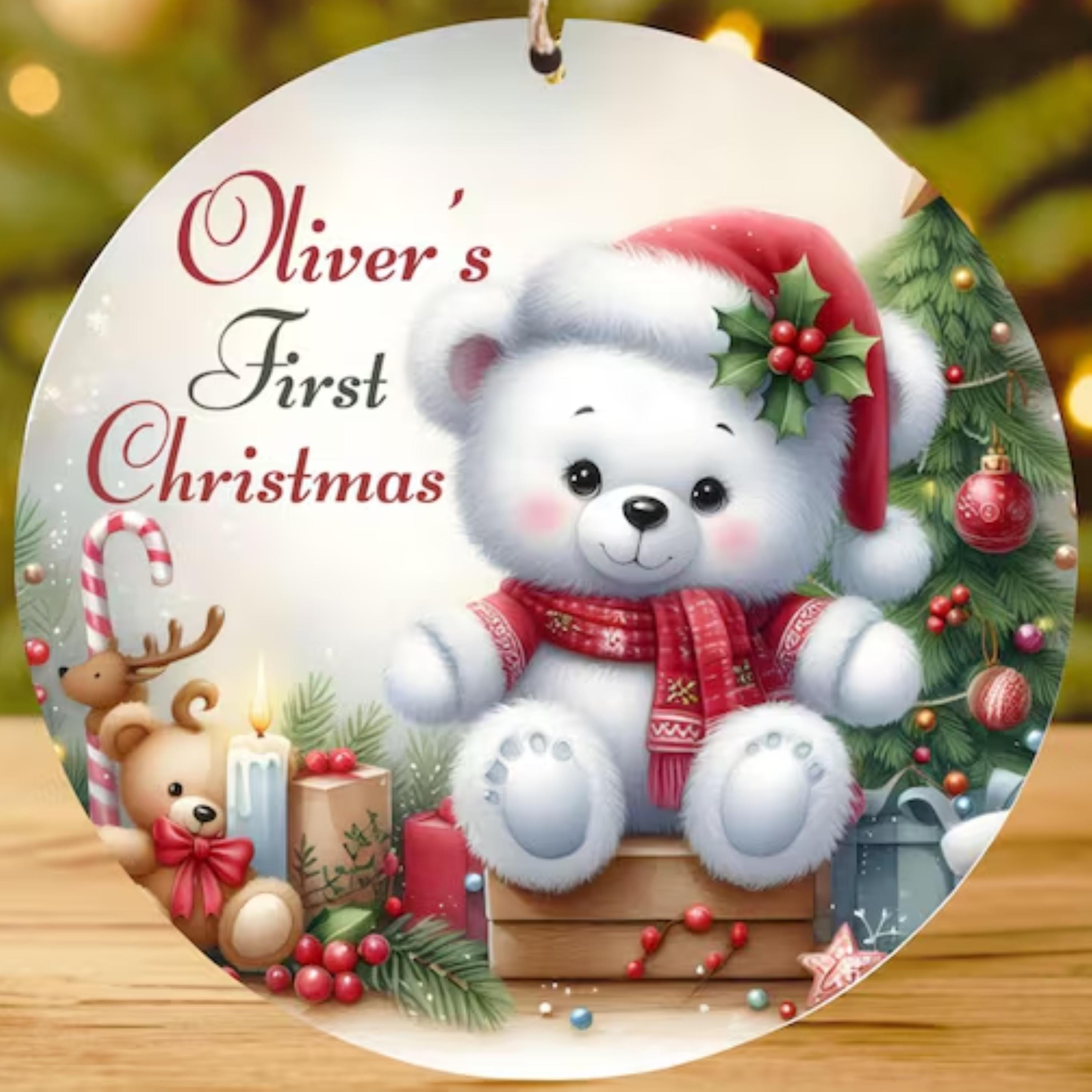 Cute Baby's First Christmas Personalized Ornament. Includes gift box.