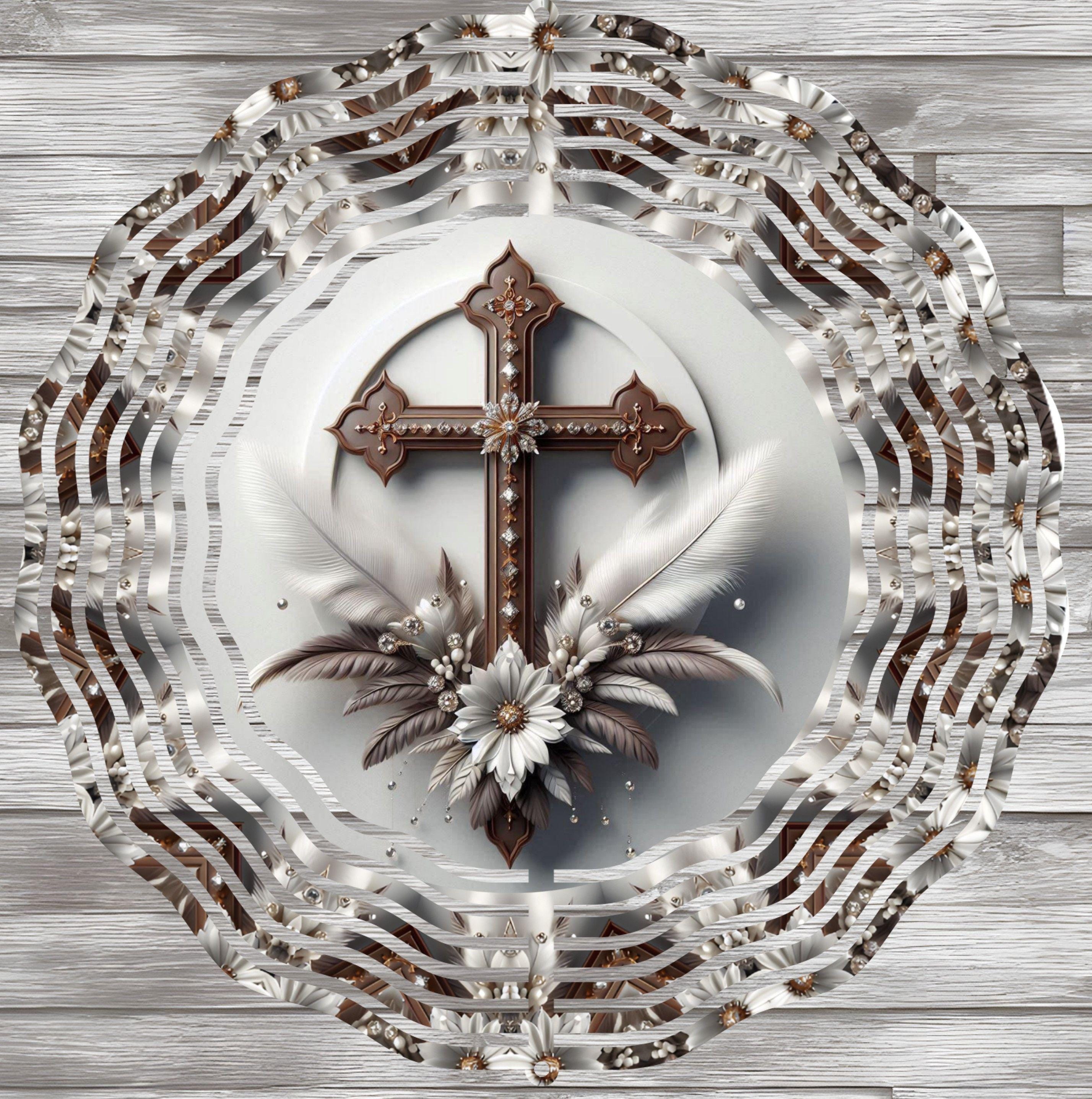 This Christian Cross 10" Wind Spinner features an elegant ornate cross, soft feathers, florals and a 3D effect.