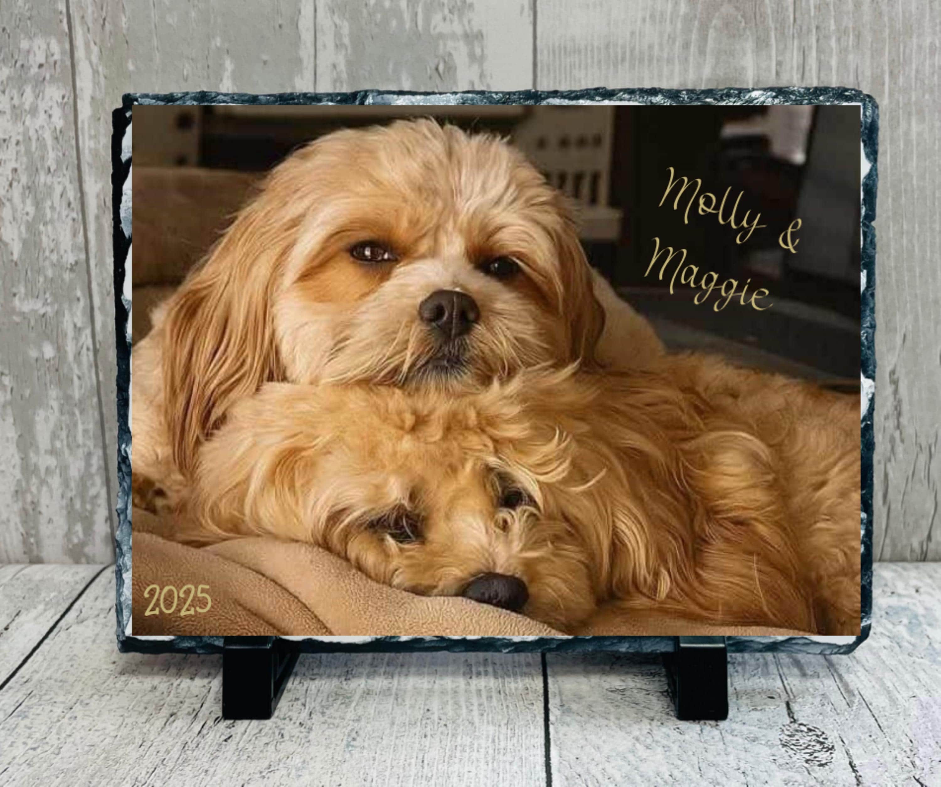 The slates have a beveled, chiseled edge and come with black plastic stands. The image is sublimated onto the slate and will not fade or scratch.
